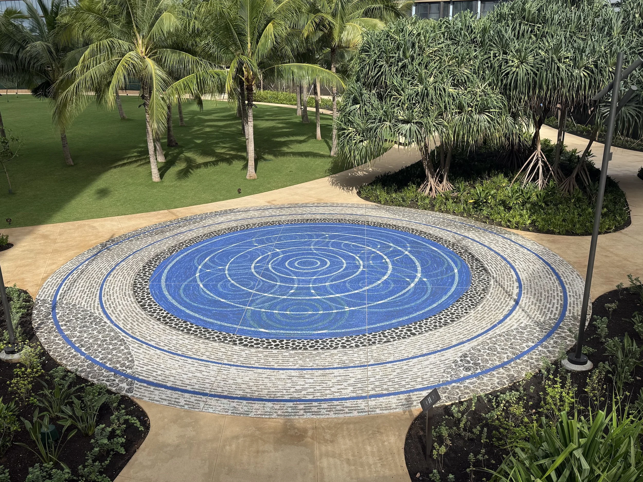 The two blue rings on the outside symbolize high and low tide. The black rocks are the suggestive visual of traditional rock walls, and the pathways become currents and entryways into the fishpond.